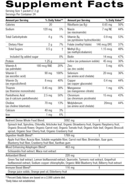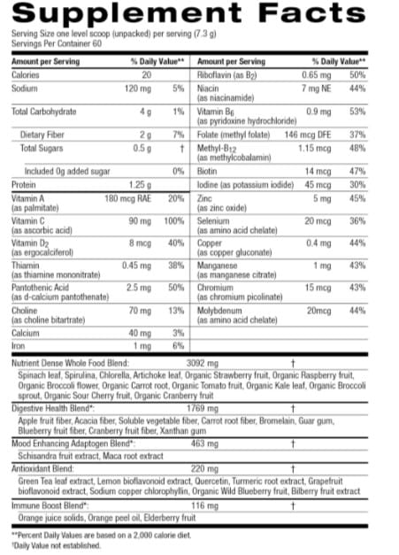Nutrient Dense Whole Food Blend 3,092 mg Provides two servings of organic vegetables and fruits for foundational nutrition